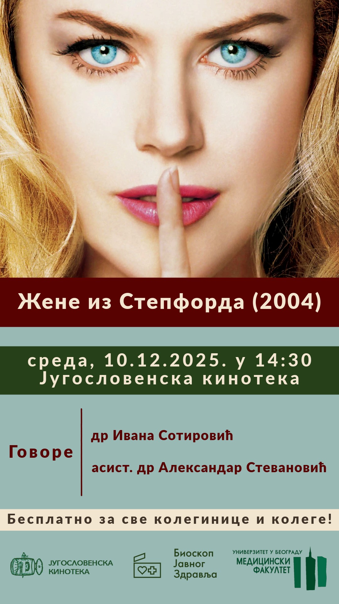 Пројекција филма “Жене из Степфорда“ одржаће се у среду, 10.11.2025. године у 14:30 у сали Макавејев Југословенске кинотеке (Узун Миркова 1).
