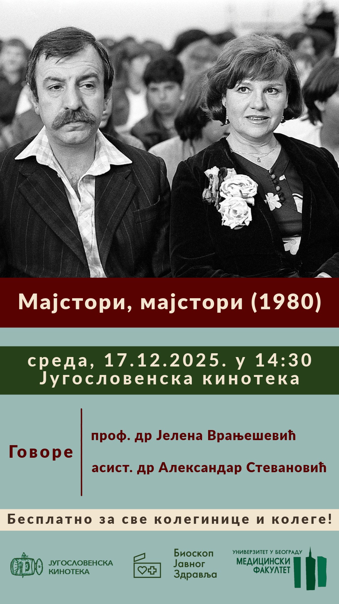 Пројекција филма “Мајстори, мајстори” одржаће се у среду, 17.12.2025. године у 14:30 у сали Макавејев Југословенске кинотеке (Узун Миркова 1).