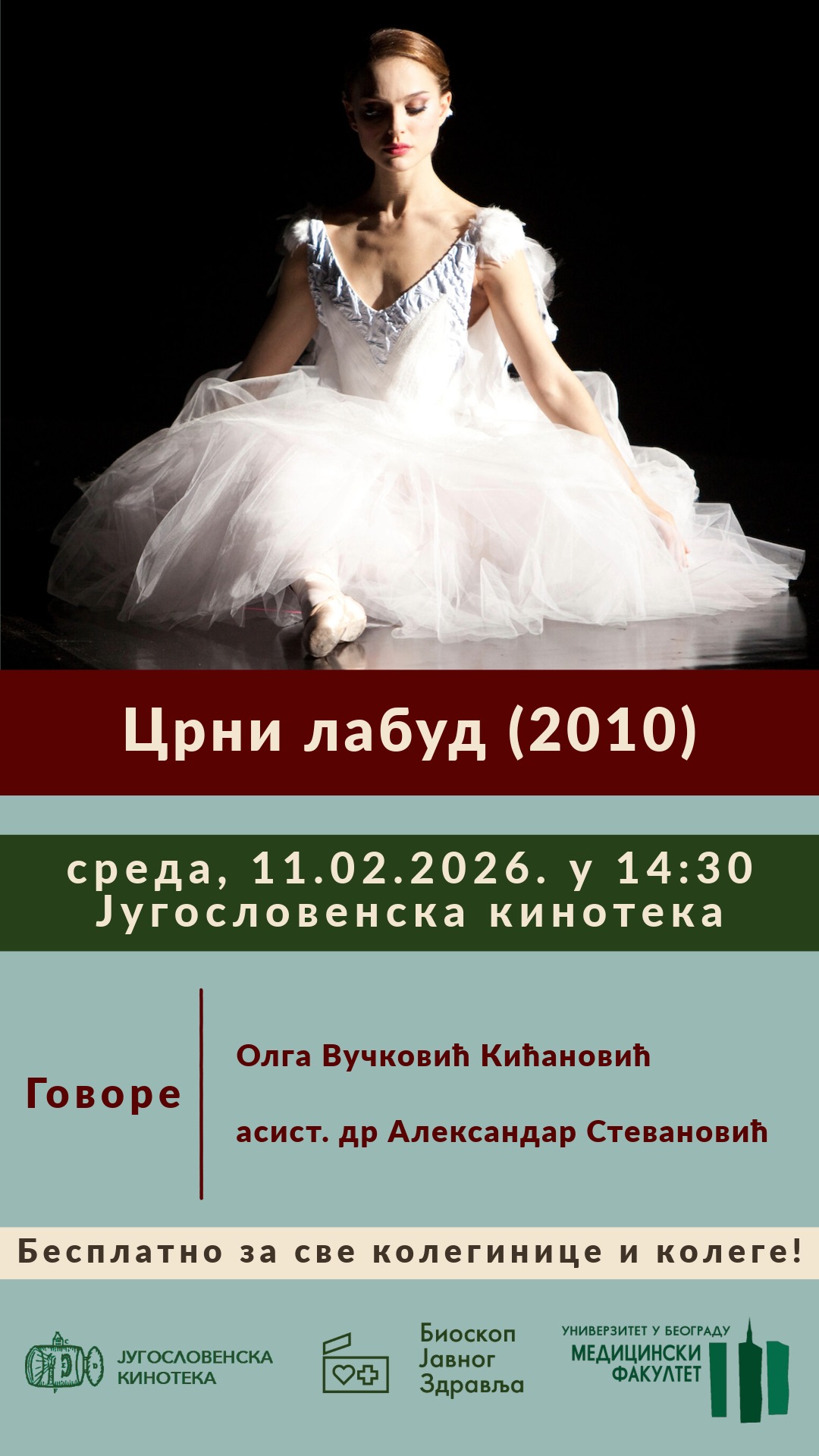 Пројекција филма “Црни лабуд” одржаће се у среду, 11.02.2026. године у 14:30 у сали Макавејев Југословенске кинотеке (Узун Миркова 1).